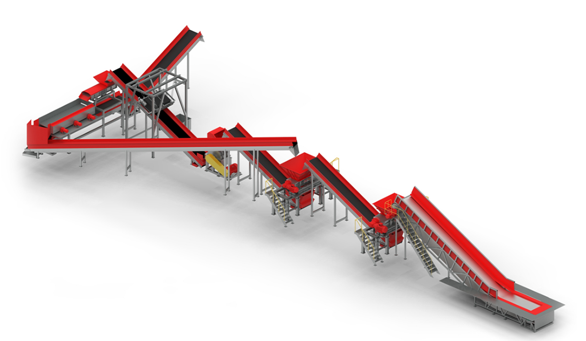 Primary Shredder + Secondary Shredder (Optional) + Iron Remover + Sedimentation Tank + Friction Washing Machine + Drum Screen + Chain Plate Conveyor + Belt Conveyor + Screw Conveyor Machine
